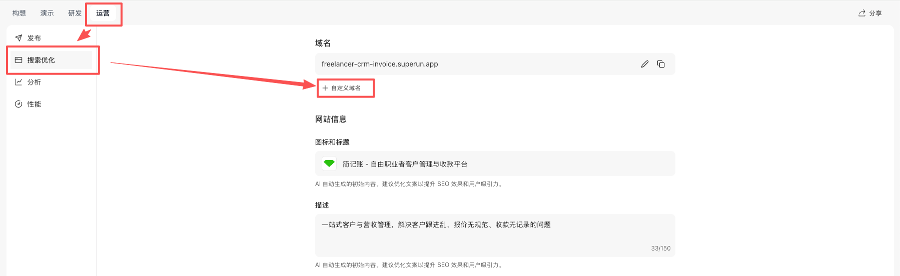通过 superun 后台配置自定义域名,可以将您的项目绑定到自己的域名上,提升品牌形象和 SEO 效果。 配置步骤:-