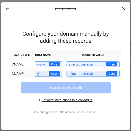 - 在”Configure your domain manually by adding these records”页面,您会看到需要添加的 DNS 记录