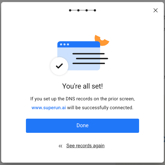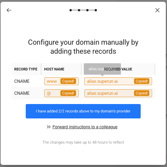 - 在域名服务商完成 DNS 记录配置后,返回 superun 配置页面
