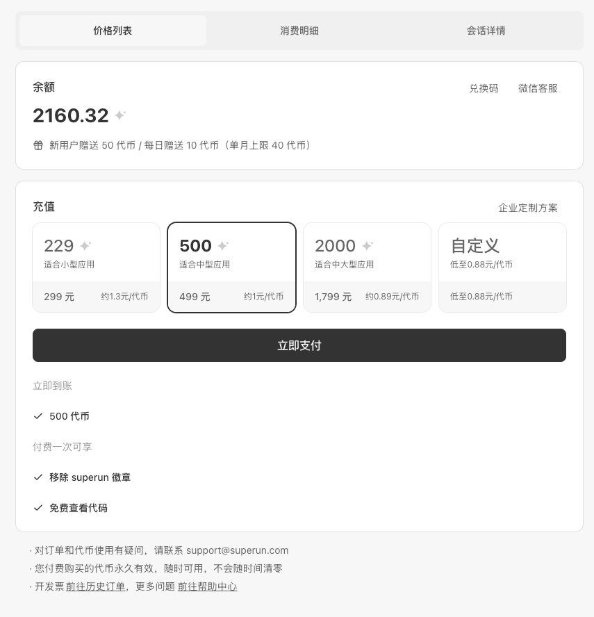 - 移除 superun 徽章:付费后可移除项目中的 superun 标记。superun 徽章默认显示在页面底部,可能会遮挡底部导航栏或操作按钮。任意套餐充值后徽章将永久移除,不再影响页面布局。